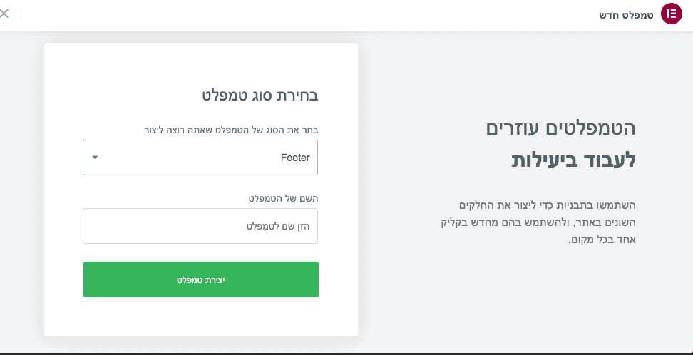 כדי ליצור כפתור זה תצטרכו ליצור אזור FOOTER. היכנסו בלוח הבקרה של האתר שלכם לאלמנטור -> הטמפלטים שלי. כעת לחצו על הוספת טמפלט כדי ליצור תבנית חדשה. בחרו בסוג FOOTER ולחצו על צור טמפלט. כעת בחרו את בלוק העיצוב המתאים ביותר לצרכים שלכם. אם יש לכם כבר FOOTER באתר אז היכנסו לעריכת הFOOTER והוסיפו בלוק חדש מעל אזור הפוטר.