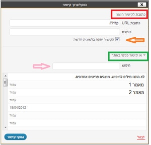 הוספת קישורים – באמצעות צמד כפתורים אלה תוכלו להוסיף או להסיר קישורים פנימיים באתר (בירוק), או קישורים חיצוניים לאתרים אחרים (באדום). בנוסף, תוכלו לבחור לפתוח את הקישור בדף חדש (מומלץ עבור קישורים חיצוניים). סרגל החיפוש הפנימי יעזור לכם למצוא את התוכן הפנימי במהרה. כך זה נראה: