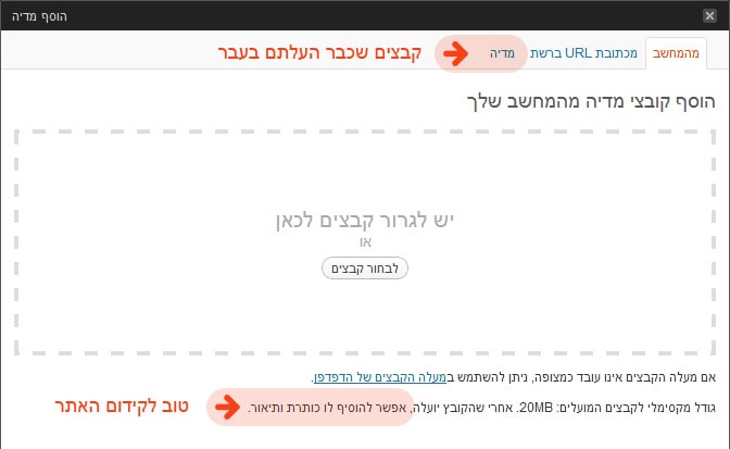 הוספת מדיה – לחיצה על אייקון קטן זה תביא אתכם לעמוד המאפשר לכם להעלות תמונות (בגרירה או בחיפוש בקבצי המחשב שלכם), להוסיף תמונות חדשות ולהוסיף קבצי מדיה אחרים. בנוסף תוכלו לערוך תמונות מבחינת גודל, מיקום מבוקש בדף, כותרת ותיאור וכדומה. רצוי לא להעלות קבצי תמונה עם שם בעברית (אנא תנו לתמונה שם במספרים או באותיות לטיניות ולאחר העלתה תוכלו לשנות אותו). כך נראה ממשק המדיה (ב-וורדפרס 3.5 בוצעו שיפורים בכל נושא ניהול המדיה והוא נראה טיפה שונה):