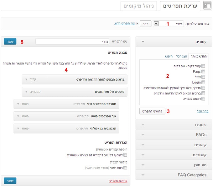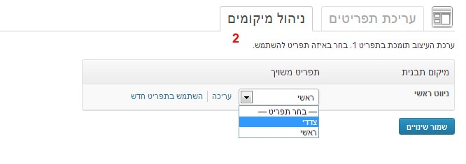 2. בלשונית ניהול מיקומים תוכלו לבחור איזה תפריט יוצג באיזה מיקום באתר. ערכות עיצוב בסיסיות תומכות בדרך כלל בתפריט ניווט ראשי אחד.