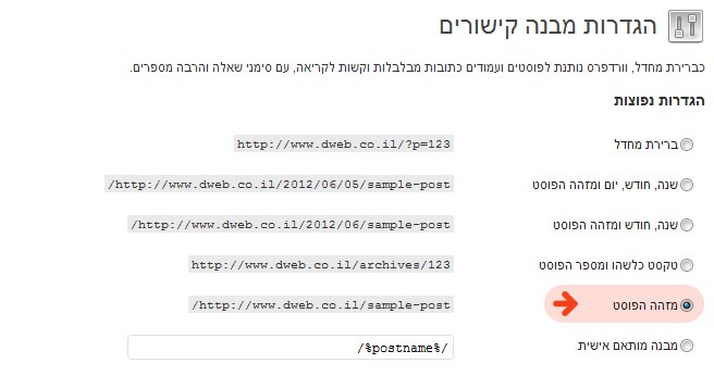 לשונית מבנה קישורים – לשונית חשובה מאוד שתקבע את הדרך בה יראו כתובות ה-URL של האתר. האופציה העדיפה מבחינת קידום אתרים היא בחירה של "מזהה הפוסט" – בחירה זו קובעת כי כל פוסט מקבל את שמו ב-URL וזהו עוד יתרון קל בקידום האתר. ישנה גם אפשרות להגדרה אישית אך לא רצוי להשתמש בה ללא ידע בנושא.