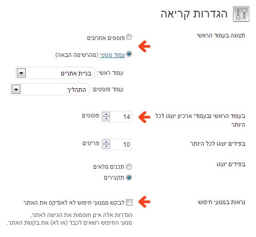 בחירה נוספת בלשונית קריאה היא כמות הפוסטים שיוצגו בעמודים ראשיים כמו עמודי קטגוריה והצורה בה הם מוצגים – כפוסטים מלאים או רק כתקציר.